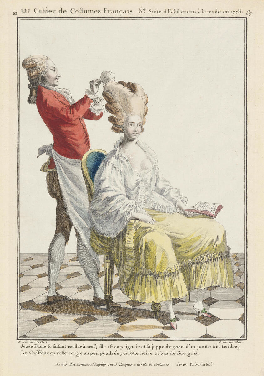 The hairdresser powders his client’s hair with a puff, transforming the brunette into a blonde. To pass the time, the woman is reading a book, L’art d’aimer (The Art of Loving). Likely a translation of Ovid’s Ars Amatoria, this book signals her sophistication and possibly hints at a romantic rendezvous.